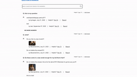 Based on the selected product, Questions and Answers displays a list of questions sorted by helpfulness. If the questions have answers, they will also be sorted by helpfulness, but you can only see two. If you select the "SEE MORE ANSWERS" text (button), you will see the remaining answers. To see more questions, select the "MORE ANSWERED QUESTIONS." There are also ways to add questions and answers by their coresponding buttons (Add A Question and Add Answer). Reporting an answer will remove the answer after returning to the website.