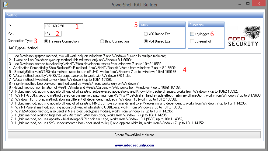 - Builder esnasında Keylogger aktifleştirilmiş ise, bağlantı aldıktan sonra "Start-KeyLogger" komutu ile klavye dinlemesi aktif hale getirilir. O andan itibaren basılan tüm tuşlar %TEMP% dizini altında keylogger.txt adıyla kaydedilecektir.