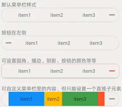 - 简介:继承ViewGroup(RelativeLayout)实现可展开收起的水平菜单栏控件