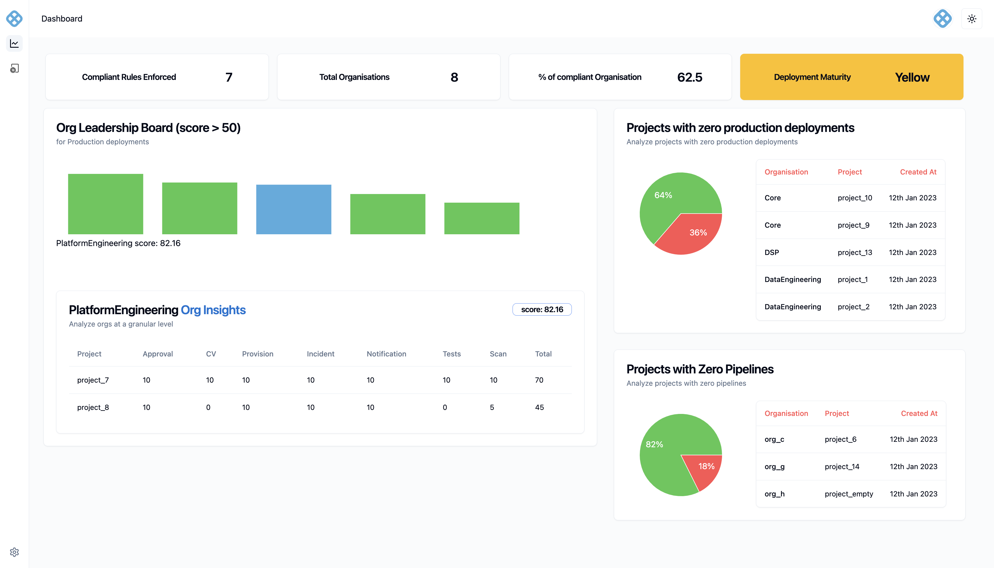 a) Leadership board with top 5/7 performing units/teams to drive healthy competition and keep leaders in check on how to improve further. b) To show visibility into those projects that are not deploying to production, where there are no pipelines, no services.
