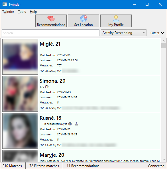 First and foremost, this is a desktop application, so you don't need to reach your phone to Tinder, which is the main advantage of this program. Second, every match is saved on your computer, so you will never lose the girl that unmatched you! You can filter your match list to find the match you desire - no more boring scrolling just to find the girl you need. Most of the other advantages are derivatives of the main advantage e.g. you can chat with multiple people at one time and view photos more comfortably.
