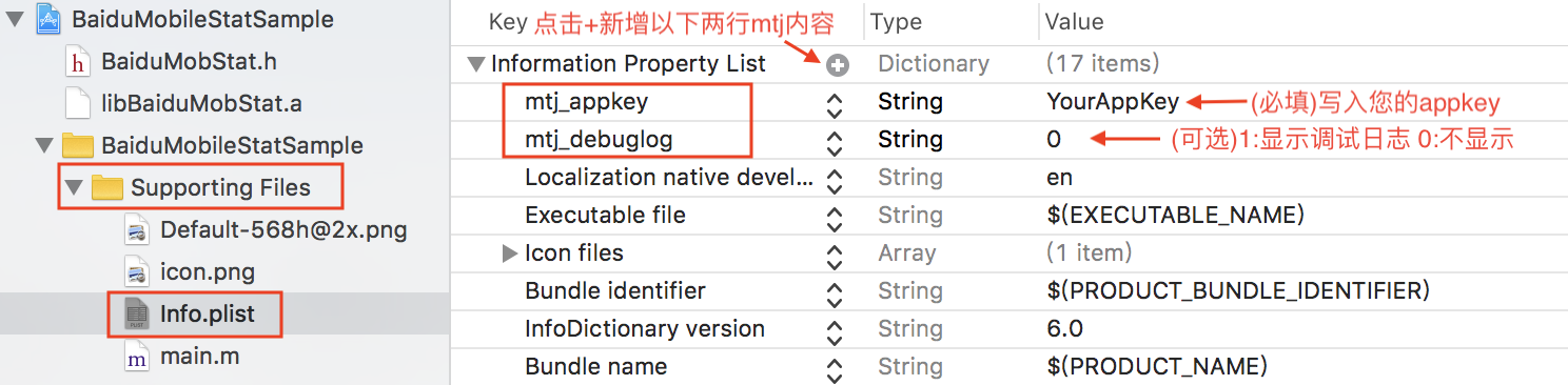 3)编辑info.plist配置文件:打开主工程下Supporting Files文件夹下的info.plist文件,按照如下示例,新增mtj_appkey、mtj_deubglog两行参数,并写入您的appkey