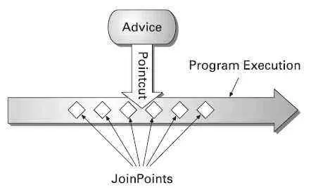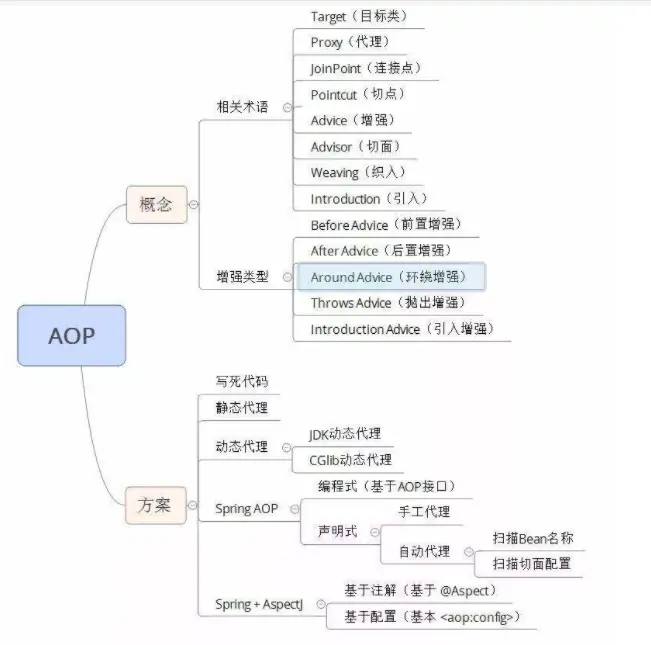 Aspect: Aspect 声明类似于 Java 中的类声明,在 Aspect 中会包含着一些 Pointcut 以及相应的 Advice。 Joint point:表示在程序中明确定义的点,典型的包括方法调用,对类成员的访问以及异常处理程序块的执行等等,它自身还可以嵌套其它 joint point。 Pointcut:表示一组 joint point,这些 joint point 或是通过逻辑关系组合起来,或是通过通配、正则表达式等方式集中起来,它定义了相应的 Advice 将要发生的地方。 Advice:Advice 定义了在 pointcut 里面定义的程序点具体要做的操作,它通过 before、after 和 around 来区别是在每个 joint point 之前、之后还是代替执行的代码。