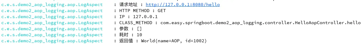 2018-01-01 21:29:01.141 INFO 36572 --- [nio-8080-exec-1] c.e.s.demo2_aop_logging.aop.LogAspect : CLASS_METHOD : com.easy.springboot.demo2_aop_logging.controller.HelloAopController.hello