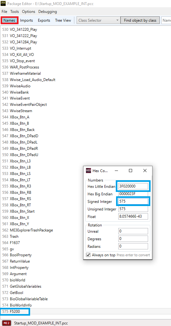 (i) Number relating to the Conditional’s name. We need to go to the Names tab (red) in the package editor, scroll to the end, and find the name we added – F5200 – and look at the number to its left (blue). In this case, the number is 575. Entering 575 into the Hex Editor provides Little Endian of 3F 02 00 00.