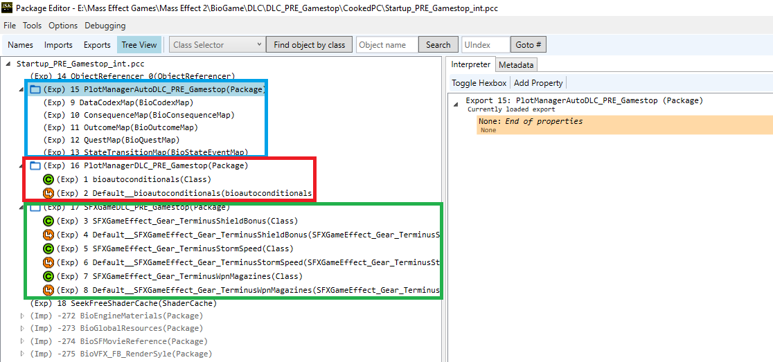 We will be using an existing DLC Startup file as a base. Startup_PRE_Gamestop_int.pcc is an excellent candidate because it is very small, but includes completely empty entries for conditionals, as well as plot information like state transitions, etc.