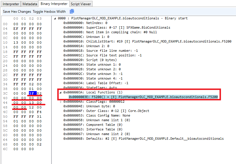 There are several things that we must amend. Selecting items on the right will cause the relevant Hex bytes to be highlighted in yellow on the left. This can be seen with the item highlighted in blue – ChildListStart. On the left, 4 hex bytes are highlighted in yellow (also underlined in blue). Further down, Local Functions is shown in red, with the 4 corresponding bytes underlined in red. We must change both of these.
