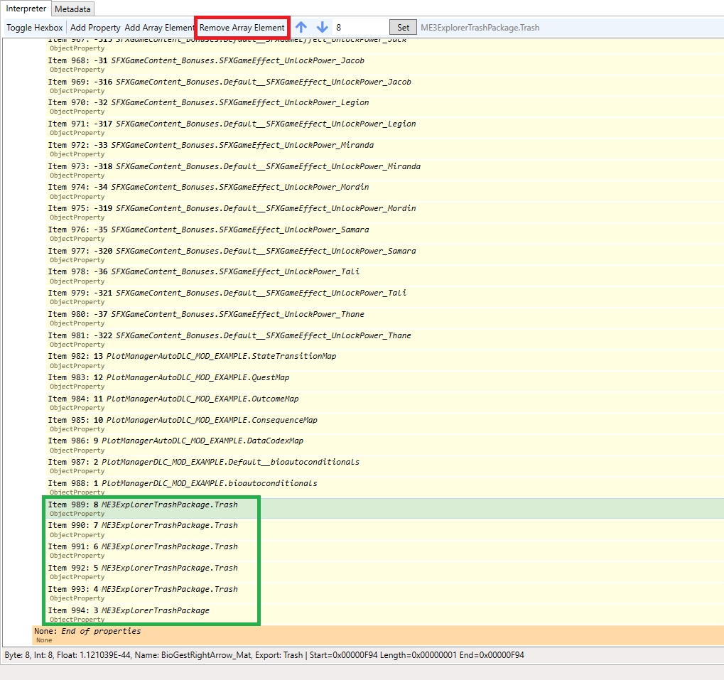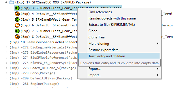 Expand Export 17 – SFXGameDLC_MOD_EXAMPLE. There will be six entries. Right-click the first entry, then choose Trash entry and children. Repeat for all six entries under Export 17.