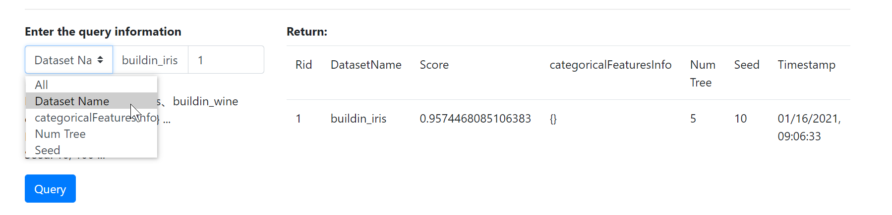 train_with_class.call_train_function(algorithm='RF', mode='train', algorithm_parameter={'dataset':'buildin_iris','categoricalFeaturesInfo':{} , 'numTrees':5,'seed':10})