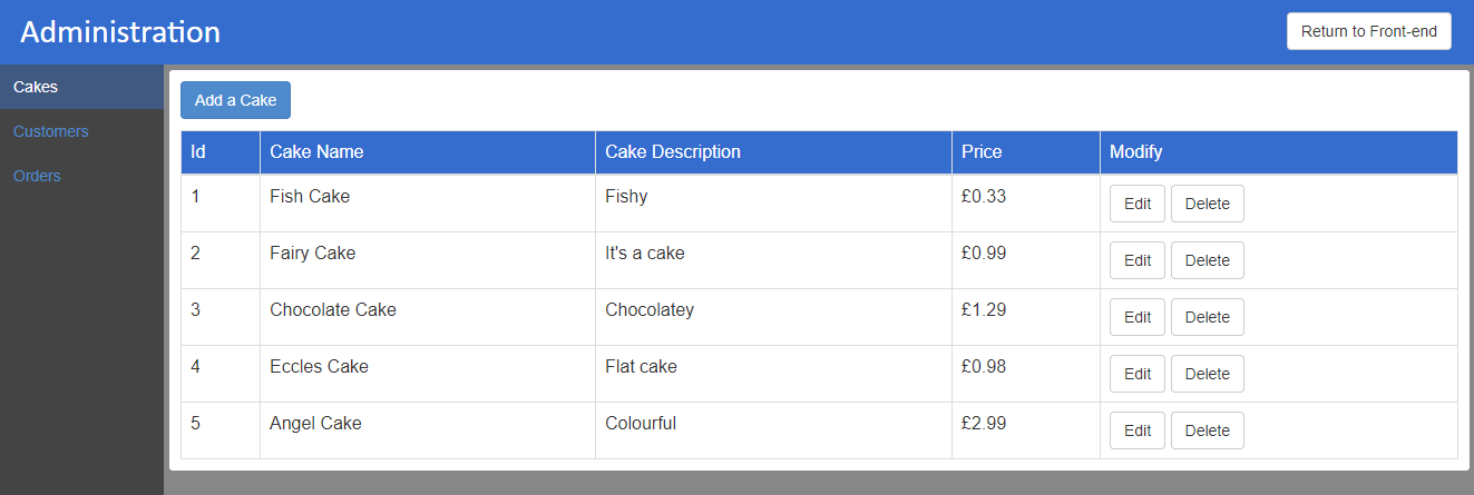 The project is a online shop built with MVC/React to buy cakes by placing orders with a functioning collapsible shopping basket, card information and persistant data storage. CakeShop also has a back-end administration section for performing CRUD operations.