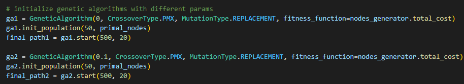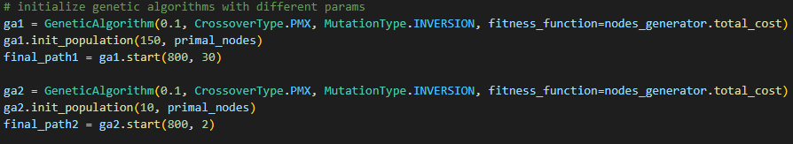 Firstly I've noticed the amount of spikes the orange graph has. Cycle Crossover is not as stable as PMX, and also produces worse results. I'm not sure whether it is a problem of my implementation or this crossover just isn't good at solving TSP. Although the answers are still good enough, PMX is more suitable for the Traveling Salesman Problem.