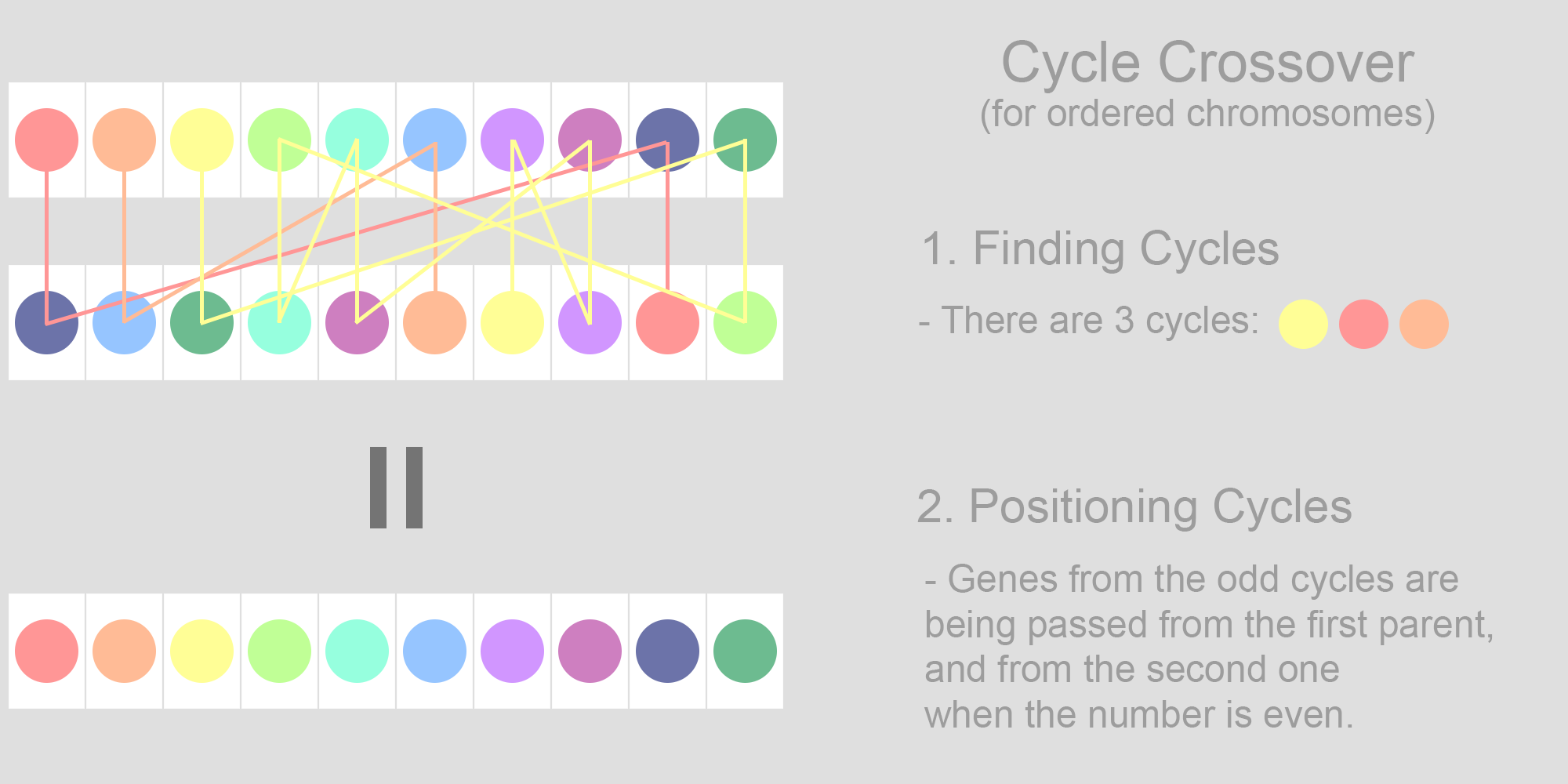 SET used_genes TO empty sequence SET cycles TO empty sequence SET offspring TO empty sequence FOR each element of the parent one: IF parent's element is not in the used_genes: SET cycle TO sequence of two elements: parent_one_element with current index, parent_two_element with current index WHILE first cycle's element is not equal to the last cycle's element: APPEND element of the second parent with an index of the last cycle's element in the first parent TO cycle SET cycle TO cycle without the last element APPEND cycle TO cycles CONCATENATE used_genes WITH cycle FOR each element of the both parents: IF an element of the parent one is in an odd cycle: APPEND second parent's element TO offspring ELSE IF an element of the parent one is in an even cycle: APPEND first parent's element TO offspring