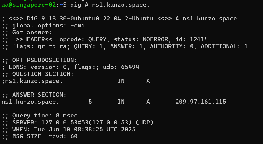 $ORIGIN . $TTL 5 ; 1 day kunzo.space IN SOA ns1.kunzo.space. rachelsun5.gmail.com. ( 2025061033 ; serial 5 ; retry (30 minutes) 300 ; expire (2 weeks) 5 ; minimum ) kunzo.space IN NS ns1.kunzo.space. kunzo.space IN NS ns2.kunzo.space. $ORIGIN kunzo.space. ns1 IN A 209.97.161.115 ns2 IN A 159.203.21.136 $TTL 5 ; 1 minute @ IN A 146.190.147.94 www IN A 146.190.147.94- serial:版本號,如果版本號有更新的話會更新整個 zone 檔。