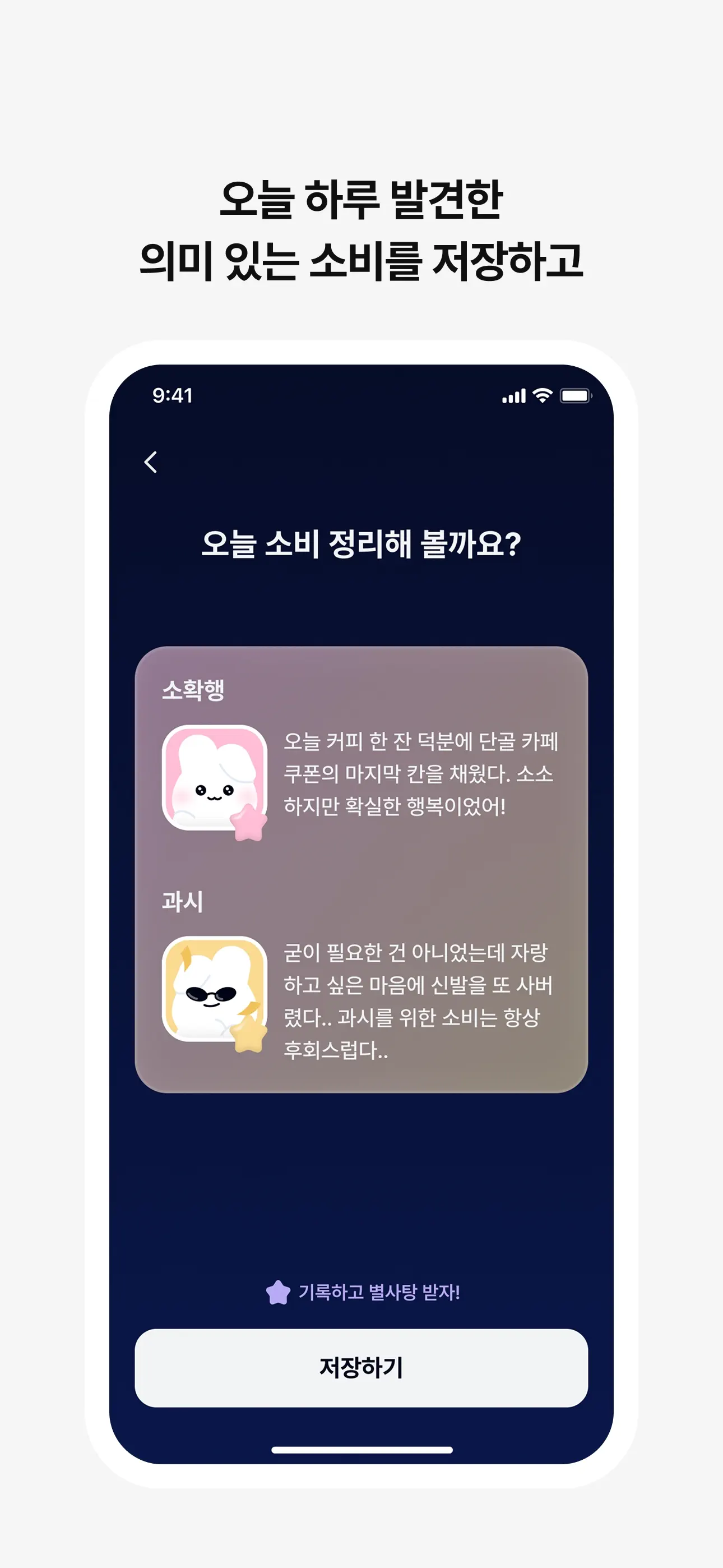 - 소비 카테고리를 고르며 소비 이유를 고민할 수 있어요.