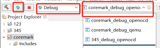 在Launch Bar区域可以选择预先创建的openocd调试配置,进行调试和程序的下载工作。