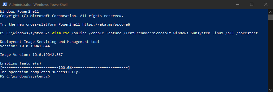 dism.exe /online /enable-feature /featurename:Microsoft-Windows-Subsystem-Linux /all /norestart