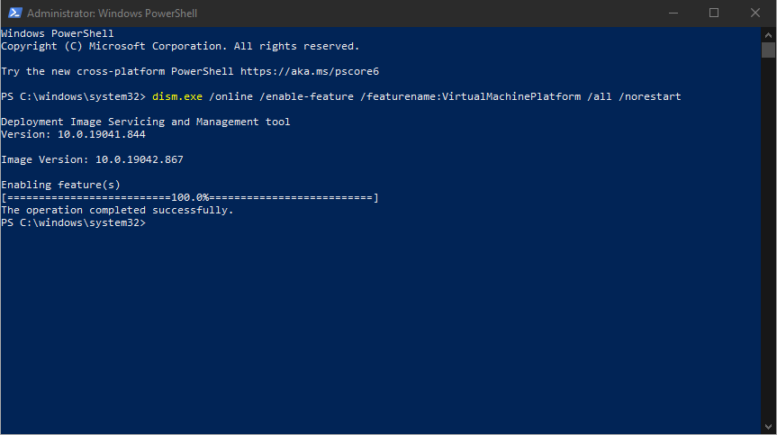 dism.exe /online /enable-feature /featurename:VirtualMachinePlatform /all /norestart
