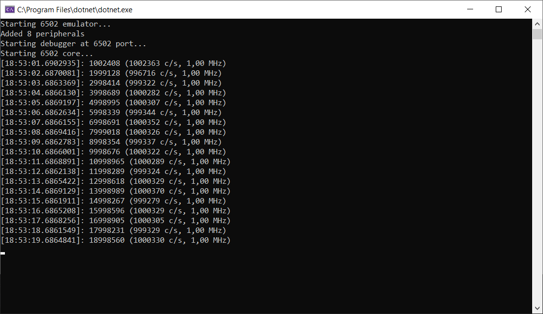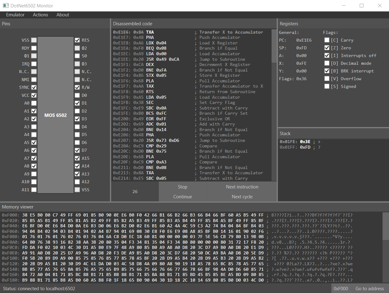 The Monitor allows viewing registers, memory, and pins of emulated MOS 6502 during its work. It's also possible to use basic debugger commands like stepping by cycle or instructions. This is the only app that is not written in .NET Core, so it will work only on Windows (because of used WPF).