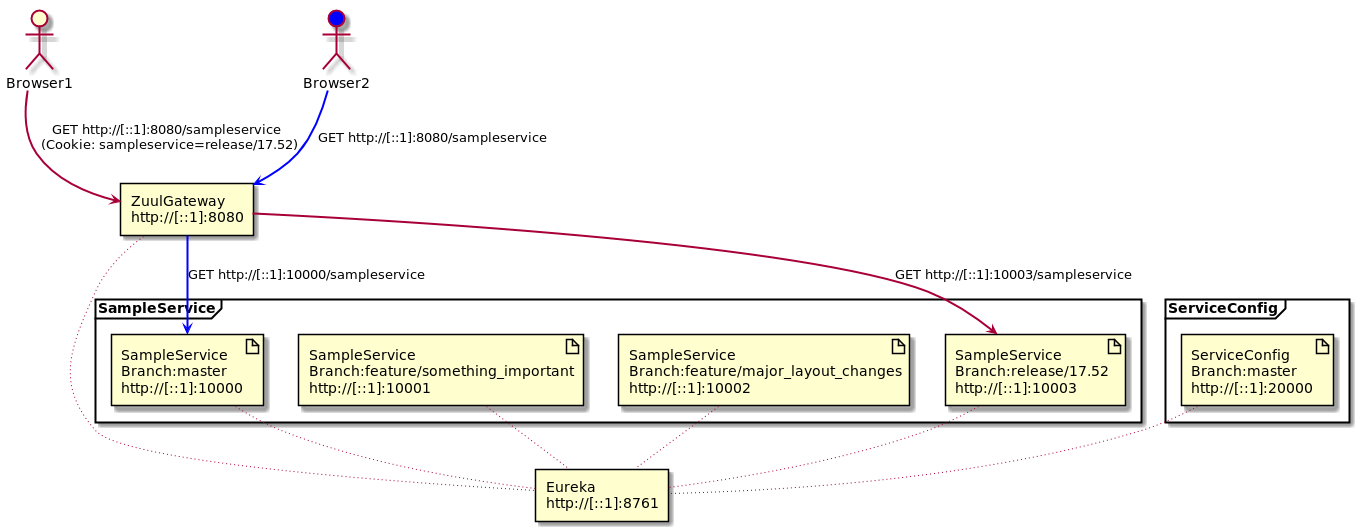 A standard Zuul instance with a small filter that looks at the users cookies to determine the correct route to the requested application instance. If no cookie is found the application with the metadata branch=master will be used.