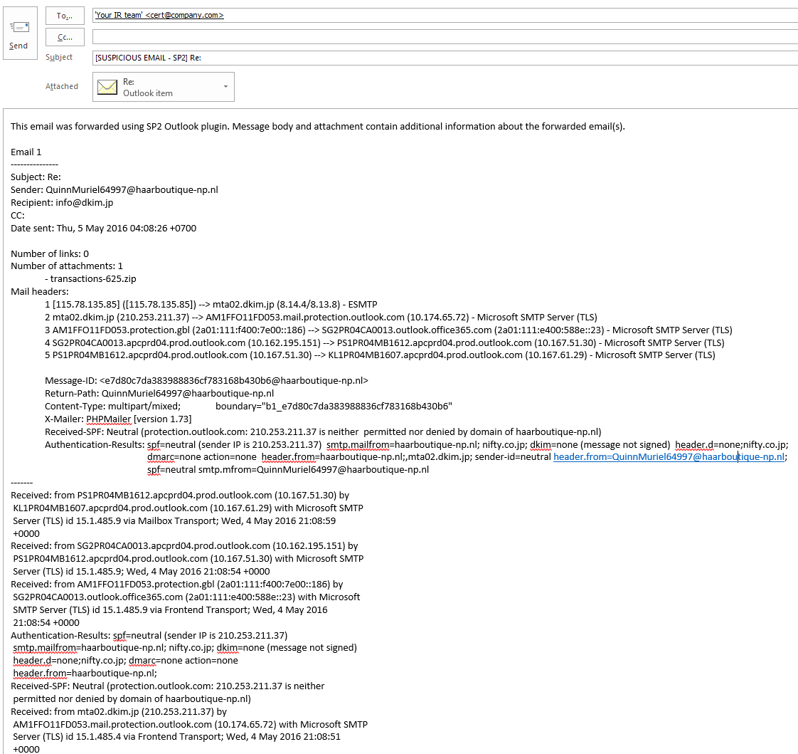 This is the mail that will be sent to configured email address (usually security/IR team) - notice the attached original message: