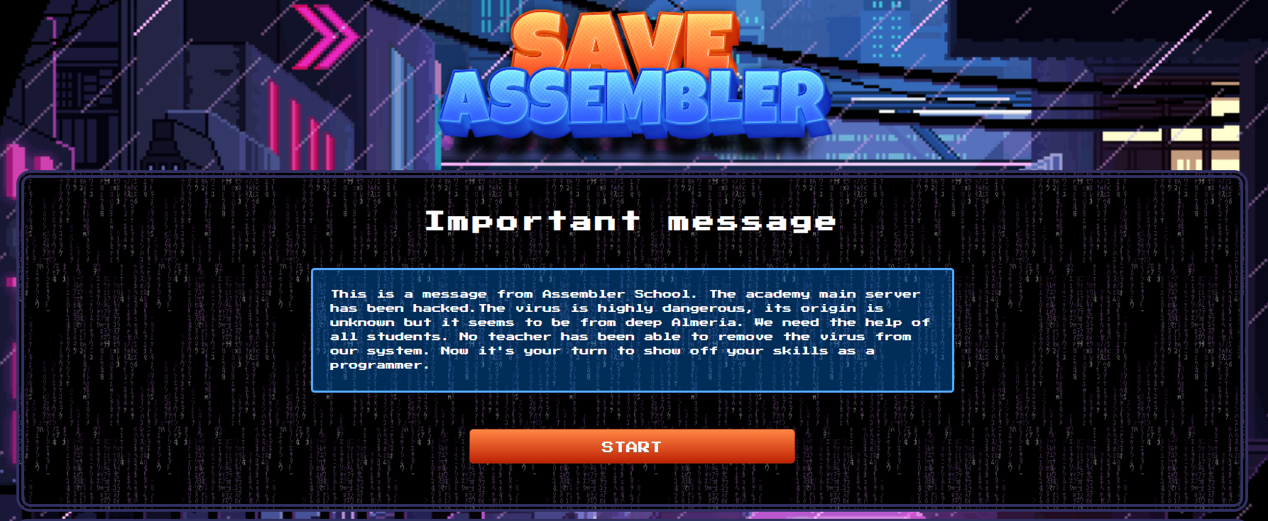"This is a message from Assembler School. The academy main server has been hacked.The virus is highly dangerous, its origin is unknown but it seems to be from deep Almeria. We need the help of all students. No teacher has been able to remove the virus from our system. Now it's your turn to show off your skills as a programmer."