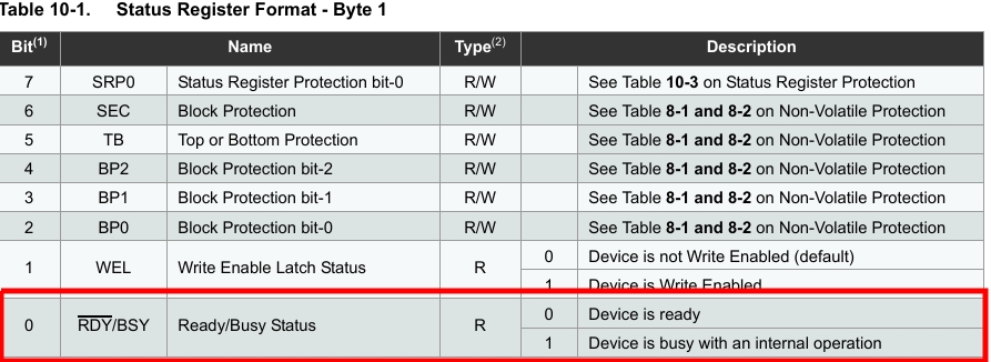 - Busy bit state - state of busy bit in status register when chip is in busy state (0/1).