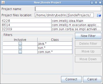 |Project name|The name of your project. It will be used for creating jSonde project files| |Project files location|Specifies a folder for storing jSonde project files. Each project consists of several files with the same name but different extensions| |Agent host|The IP address of the computer where jSonde agent is running. Value "127.0.0.1" is fine if you're executing jSonde GUI and jSonde agent on the same computer| |Agent port| TCP port for communicating between jSonde agent and GUI| |Filters|Allows you to specify filters for analyze. See chapter below|