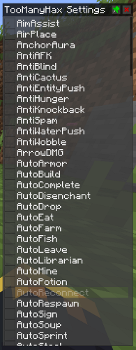 - Submenu of TooManyHax in the ClickUI/Navigator shows a list of toggleable hacks instead of needing to manually enter the name of each one via cmd.