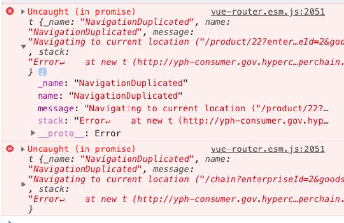 在router声明的地方加上catch ``` const originalPush = Router.prototype.push Router.prototype.push = function push(location) { return originalPush.call(this, location).catch(err => err) } ```