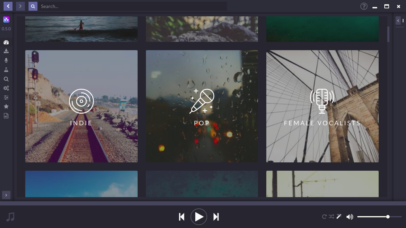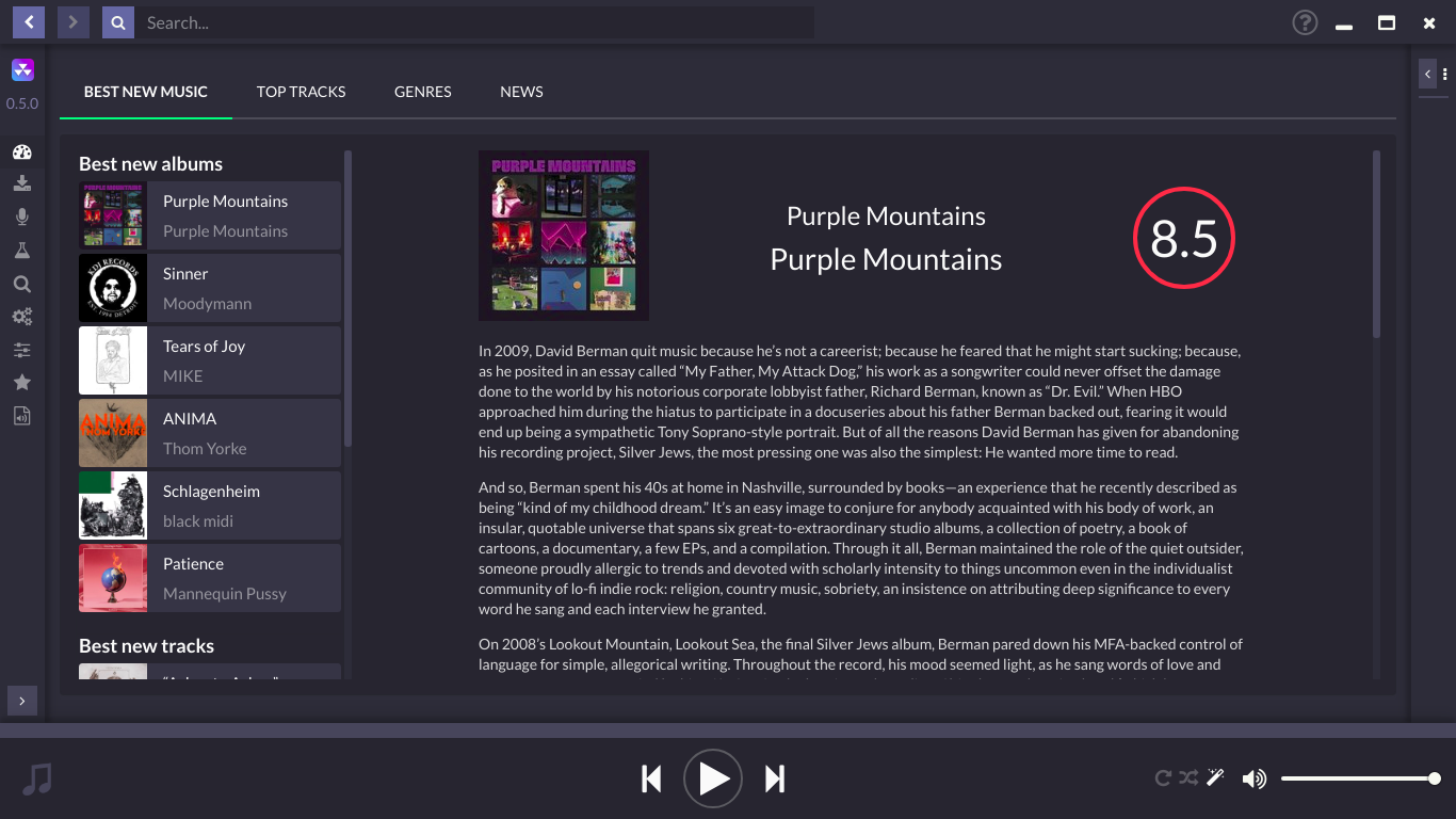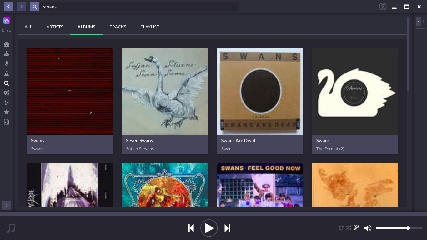 - Searching for albums (powered by Last.fm and Discogs), album view, automatic song lookup based on artist and track name (in progress, can be dodgy sometimes)