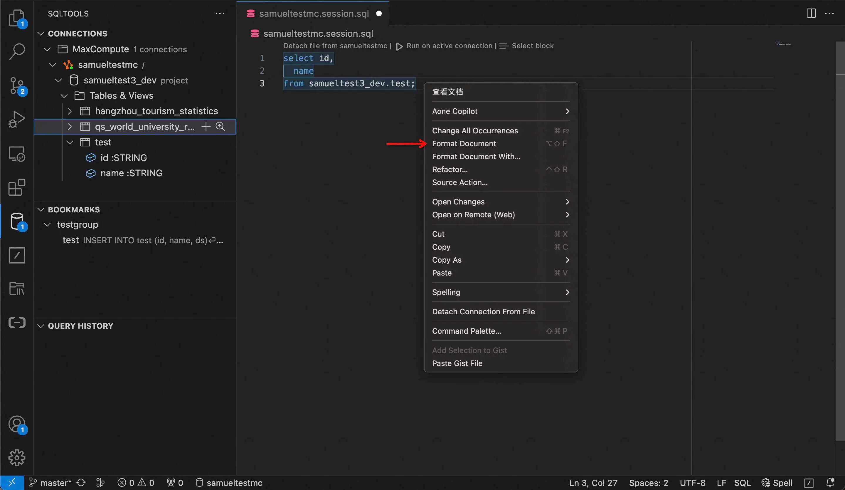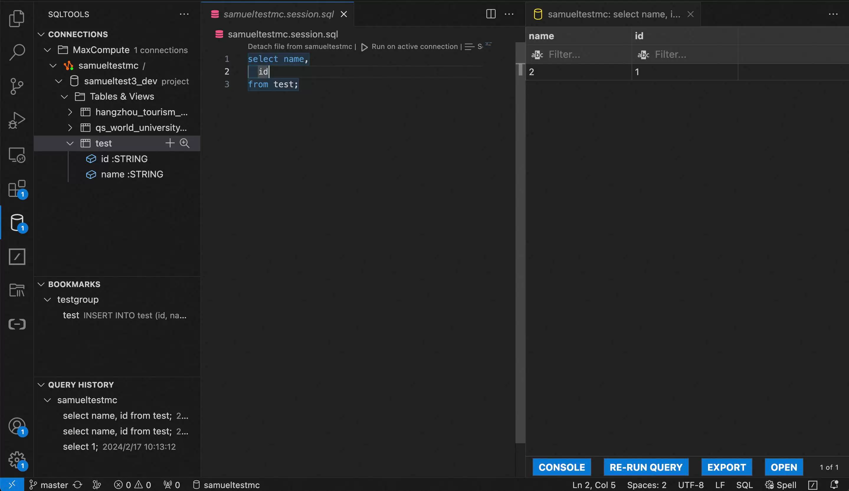This is a SQLTools plugin to integrate with Alibaba Cloud MaxCompute. Providing for running MaxCompute SQL and getting results, SQL formatting, generating SQL statements and SQL completion.