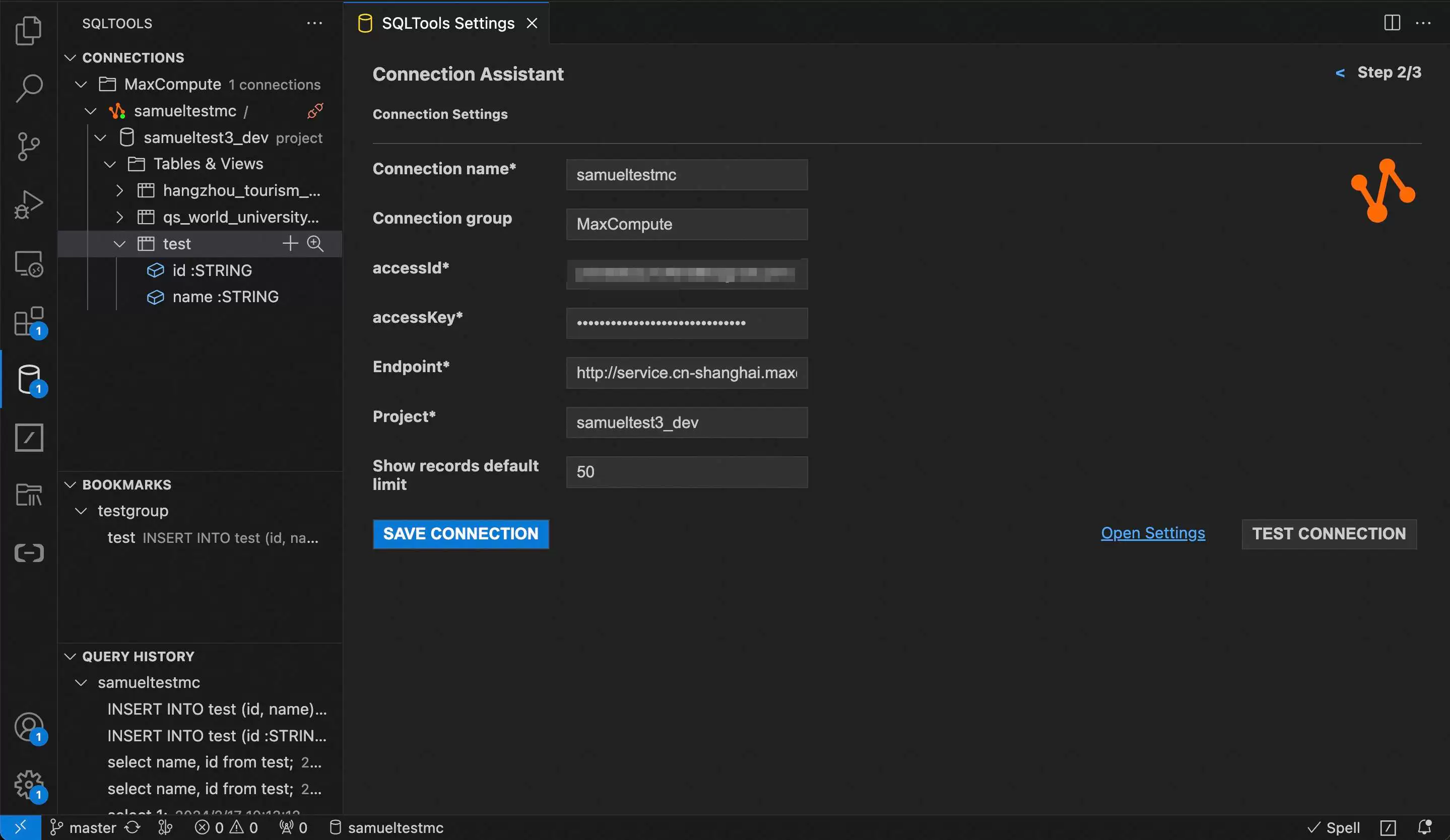 Open the SQLTools plugin and create a new connection, input your accessId, accessKey, MaxCompute project and endpoint (the endpoint depends on your MaxCompute regions, for example: http://service.cn-shanghai.maxcompute.aliyun.com/api)