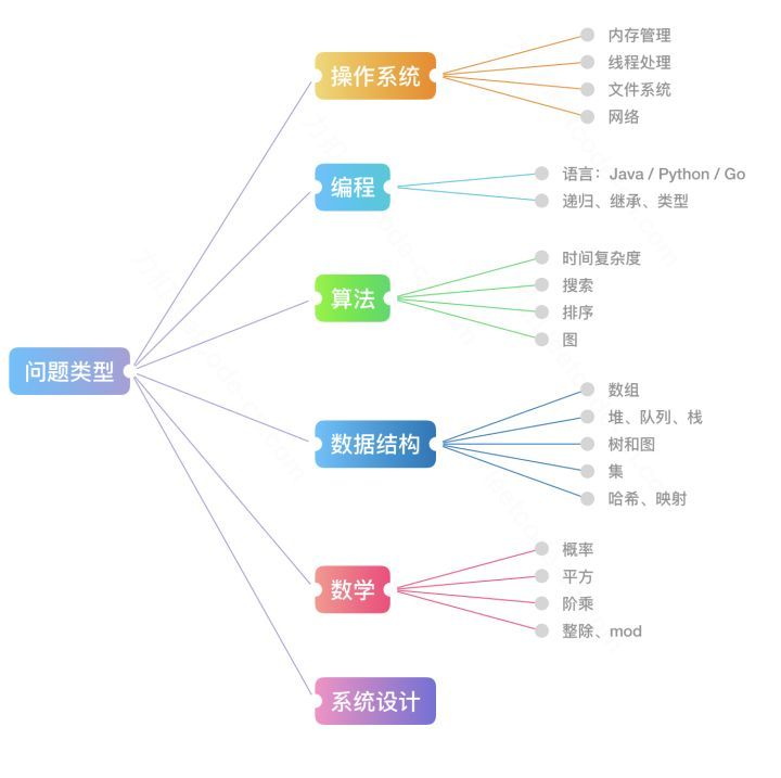 - 这里有一张互联网公司面试中经常考察的问题类型总结的思维导图,我们可以结合图片中的信息分析一下。