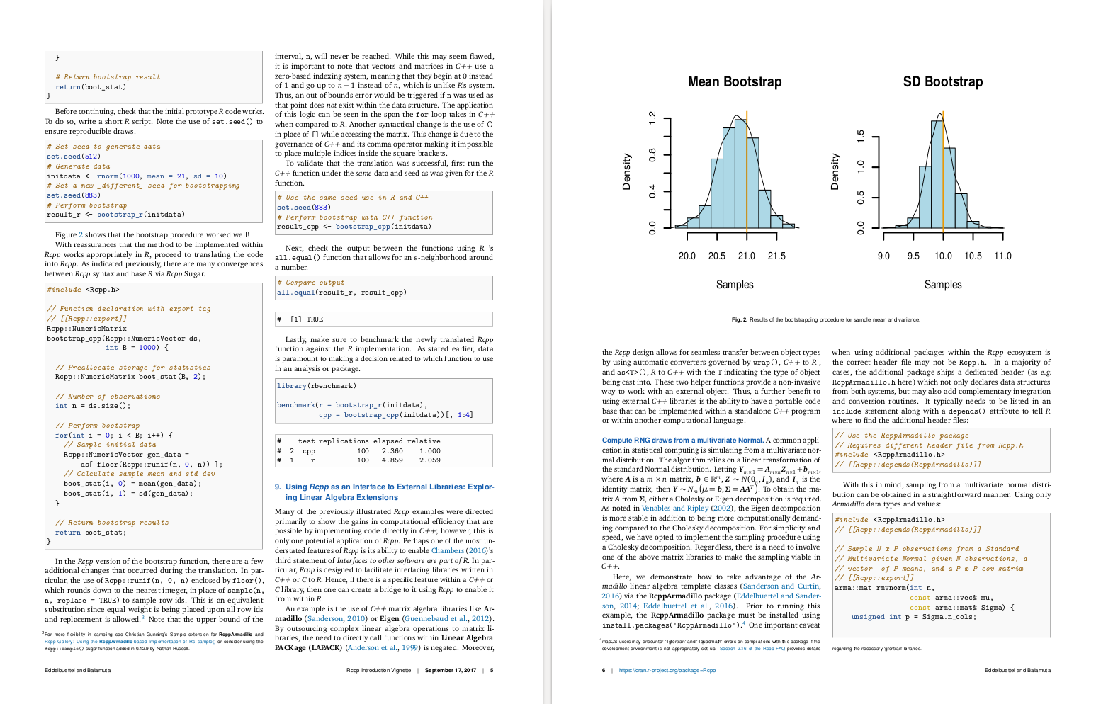 A complete pdf example of the two-column default template is provided here by the new introductory Rcpp vignette, which is itself based on our PeerJ Prepint.