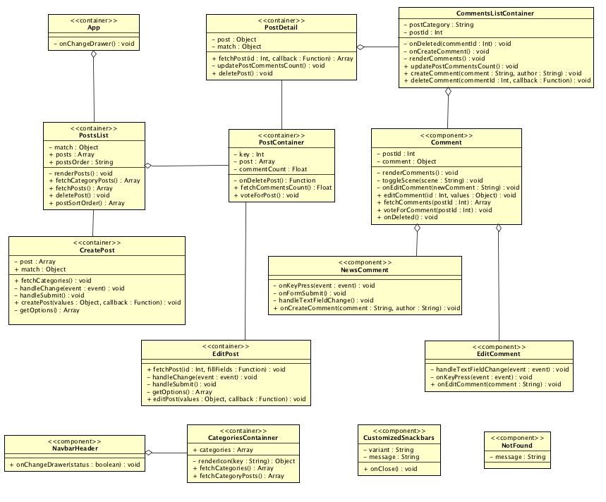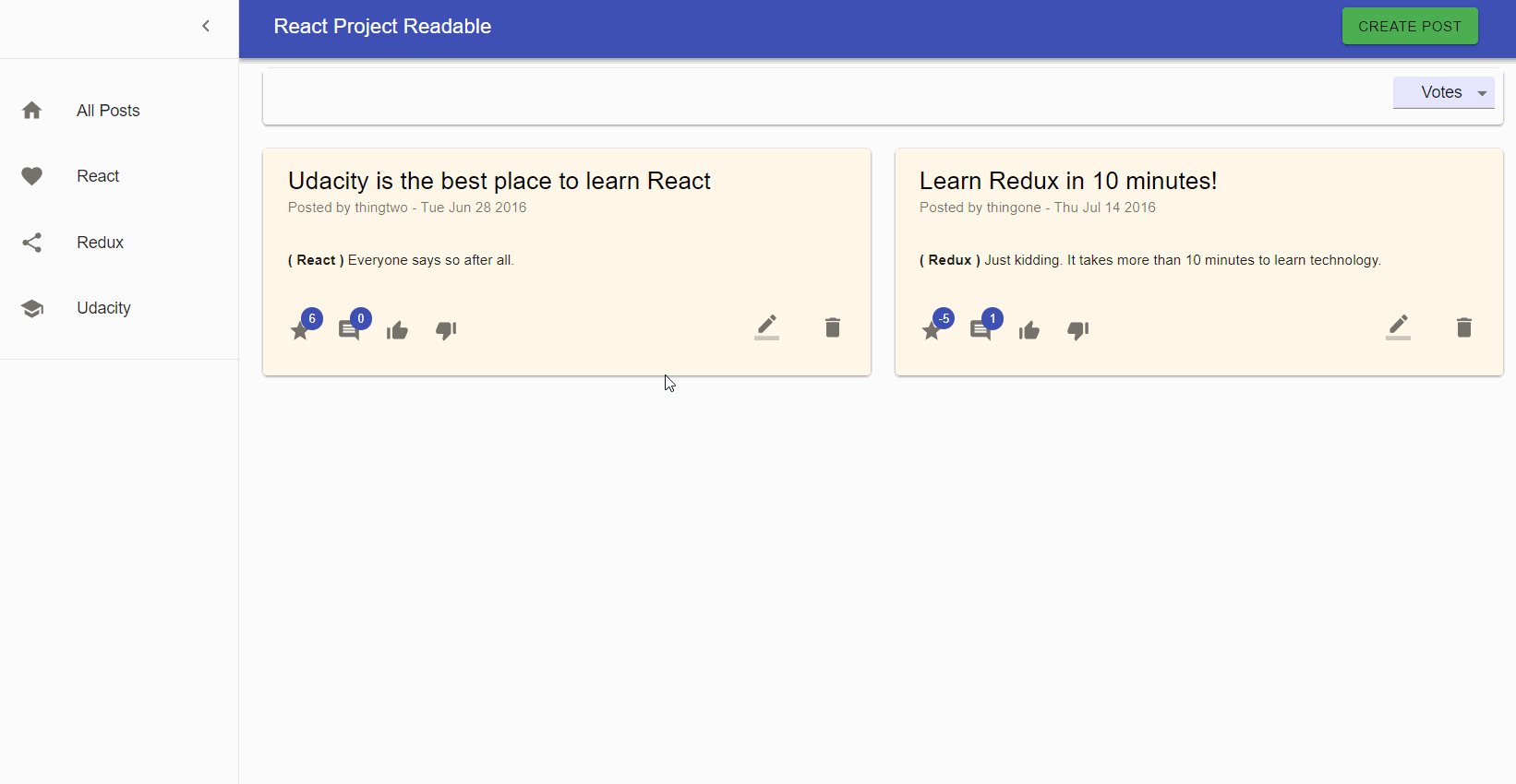 For the Readable project, you will build a content and comment web app. Users will be able to post content to predefined categories, comment on their posts and other users' posts, and vote on posts and comments. Users will also be able to edit and delete posts and comments.