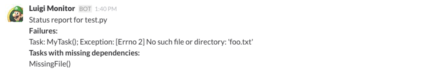 Luigi is a great tool for making job pipelines, but it's hard to know the status of a run. Luigi has support for error emails, but this requires configuring your machine to send email, which is a hassle for short-lived EMR clusters. Further, it sends an email for every failure, which can quickly swamp your inbox.