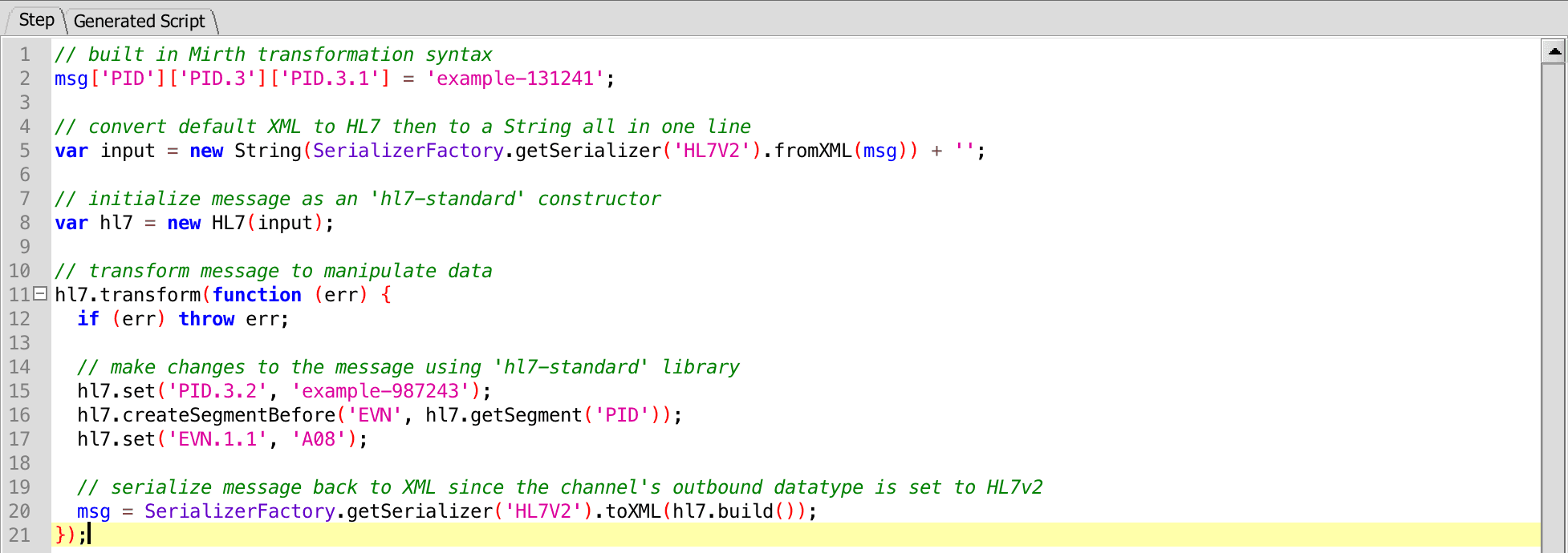 hl7.moveSegmentBefore(evnSegment, hl7.getSegment('PID'));Adding 'hl7-standard' to Mirth opens up more possibilities for data tranformations. This 20KB library can make some of the advanced mirth transformations much simplier and can aid in readability and ease of use. Can you get by in Mirth without using 'hl7-standard', absolutely; however, we find this library to be very intuitive and easier for a novice to pick up and run with.
