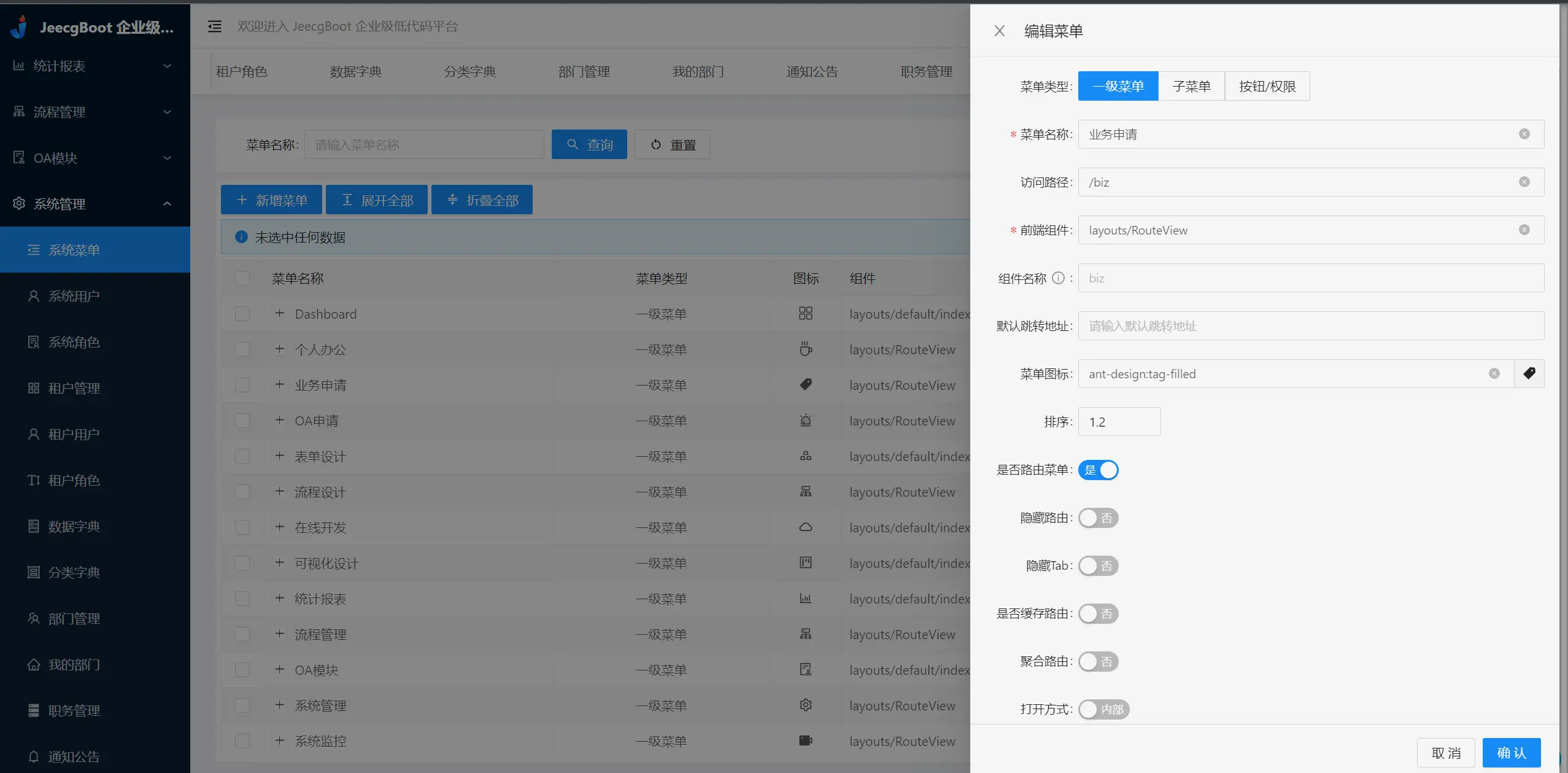 - 4.开发效率高,支持在线建表和AI建表,提供强大代码生成器,单表、树列表、一对多、一对一等数据模型,增删改查功能一键生成,菜单配置直接使用。