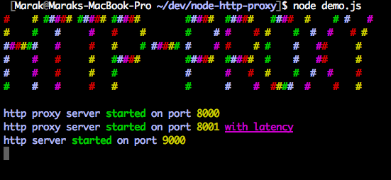 var http = require('http'), httpProxy = require('http-proxy'); // create a proxy server with custom application logic httpProxy.createServer(function (req, res, proxy) { // Wait for two seconds then respond: this simulates // performing async actions before proxying a request setTimeout(function () { proxy.proxyRequest(9000, 'localhost'); }, 2000); }).listen(8000); http.createServer(function (req, res) { res.writeHead(200, {'Content-Type': 'text/plain'}); res.write('request successfully proxied: ' + req.url +'\n' + JSON.stringify(req.headers, true, 2)); res.end(); }).listen(9000);