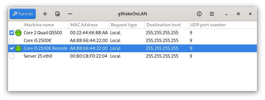From the gWakeOnLAN main window you can define your hosts along with their MAC Addresses, select those you want to turn on and just start them with a simple click on the button Turn on.