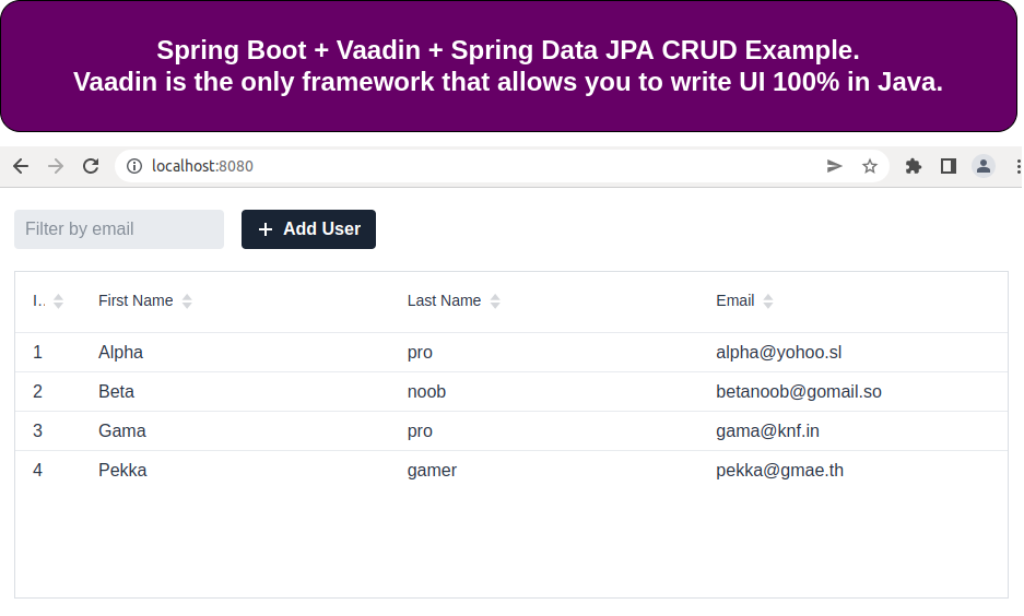 Spring Boot + Vaadin + Spring Data JPA CRUD Example Local setup Step 1: Download or clone the source code from GitHub to a local machine Backend Step 2: mvn clean install Step 3: mvn spring-boot:run From the browser call the endpoint http://localhost:8080