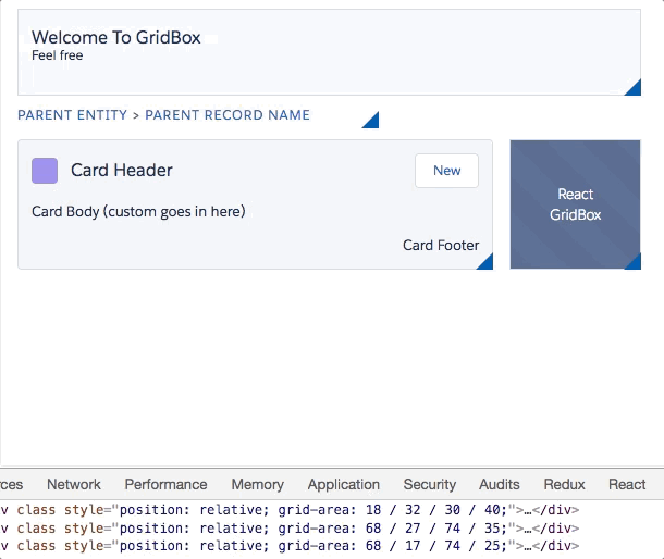 Use React GridBox like any other component. The following example below will produce a grid with store support (as react state) and three items: