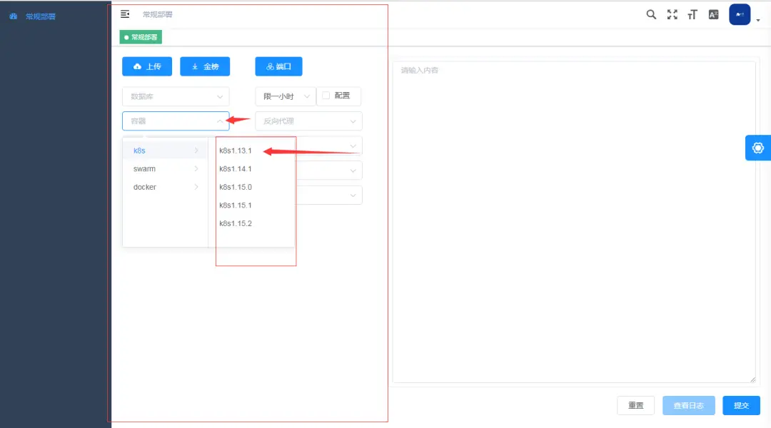 菜单栏供我们选择要部署的类别,工具,及工具的版本和集群方式(以k8s为例)