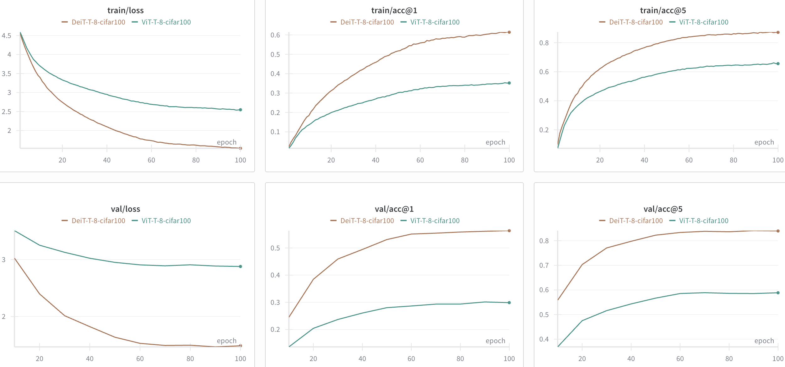 uv syncuv run train.py +run=vit-cifar100uv run train.py +run=deit-cifar100Uses frozen resnet18_cifar100 (via timm) as Teacher and is used for hard distillation (as it is showen to work well in DeiT paper)