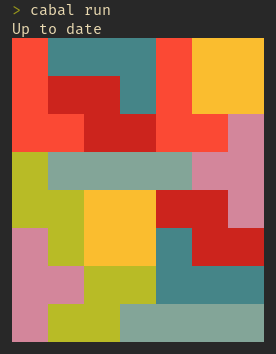 tetris-puzzle Tetris puzzle solver written in Haskell. It is an example implementation of depth-first search (DFS) algorithm. There are 233 956 different solutions for 8x7 board. Running $ cabal run It prints out a random solution for 8x7 board.