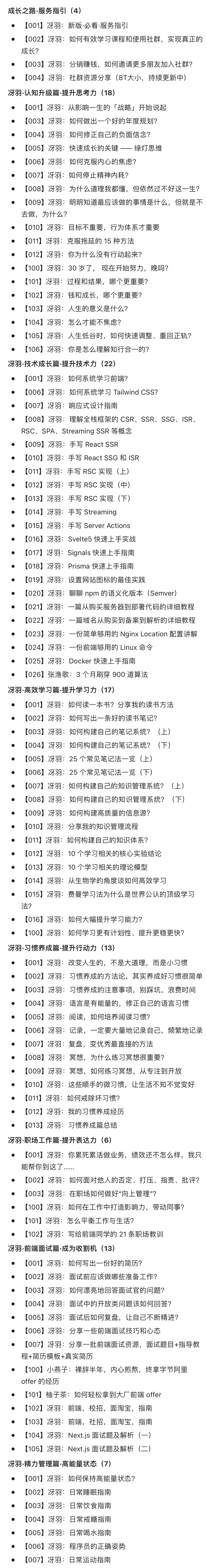 围绕这个公式,我也初步确定了自己的星球专栏目录,分别是:“认知升级篇”、“技术成长篇”、“高效学习篇”、“习惯养成篇”、“职场工作篇”、“精力管理篇”、“前端面试篇” 一共 7 个篇章。