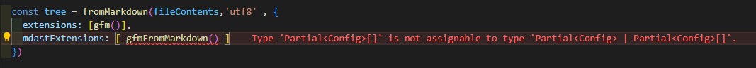 I try to convert an .md file to a mdast tree(JSON) using a gfm extention in Next.js 13 and I got an Typescript in VSC and Next.js "Cannot set properties of undefined (setting 'inTable')" error in the browser. The code is the next one: "use server"