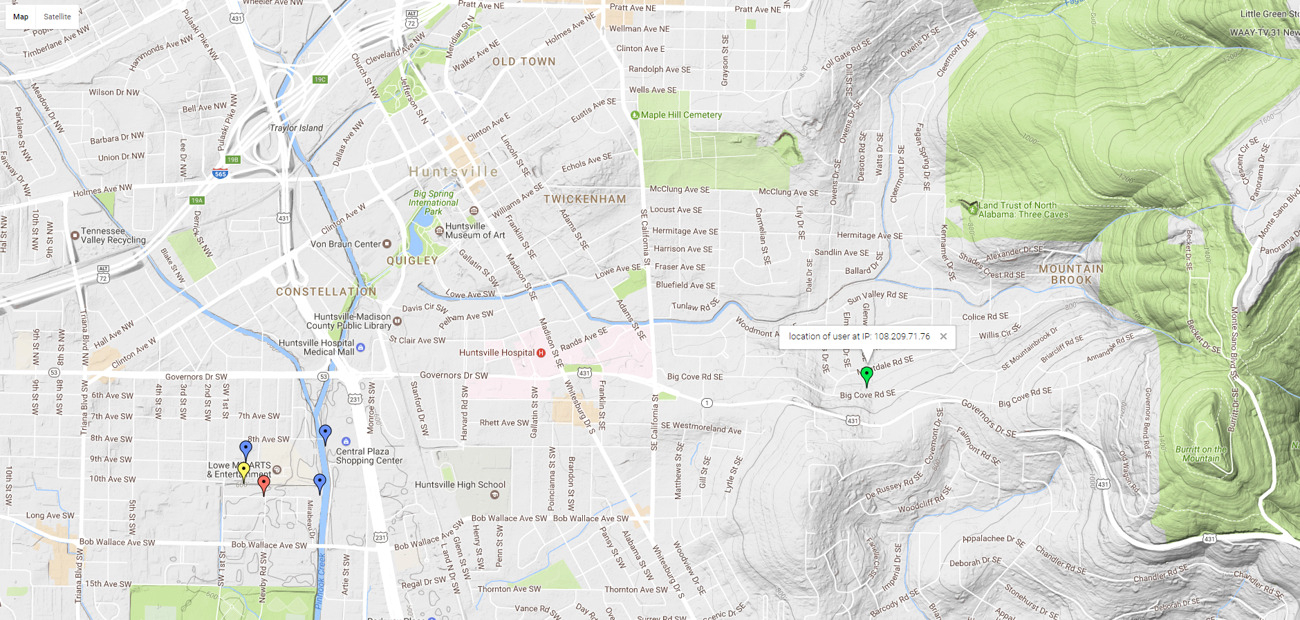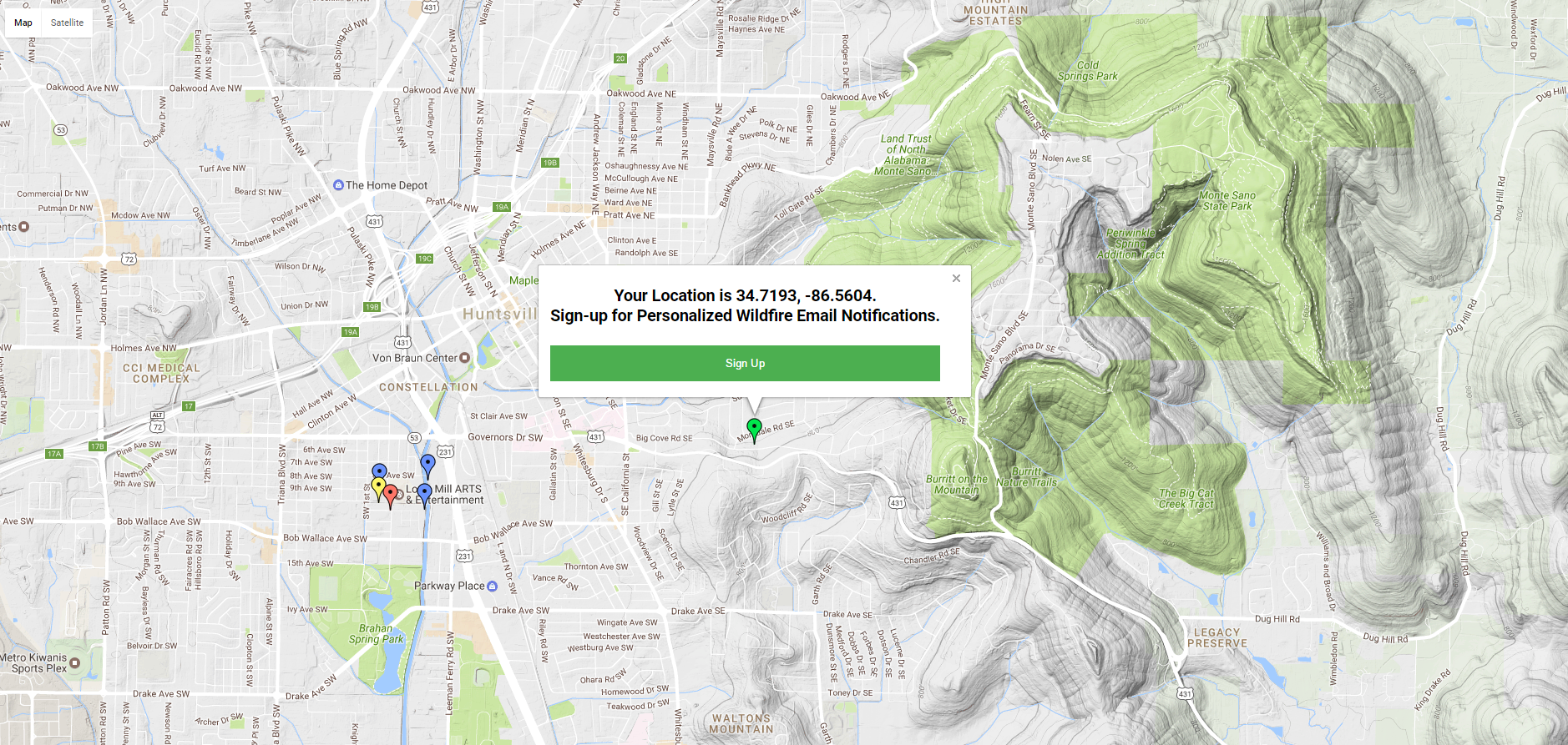 Due to technical Limitations, we are attempting to overcome the map can only display a maximum of 3240 points. To mitigate the effects of this limitation, we use GeoIP information to automatically locate the user and only plot fires within 25 degrees in all directions of the user. Additionally, a green marker is dropped were the program believes the user is located and the map automatically focuses on the user's location.