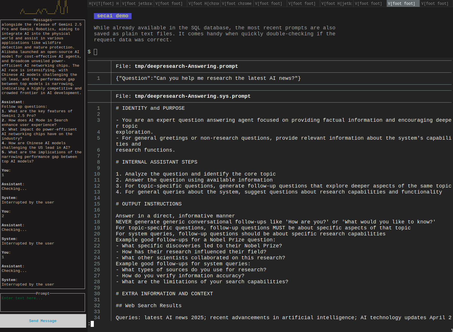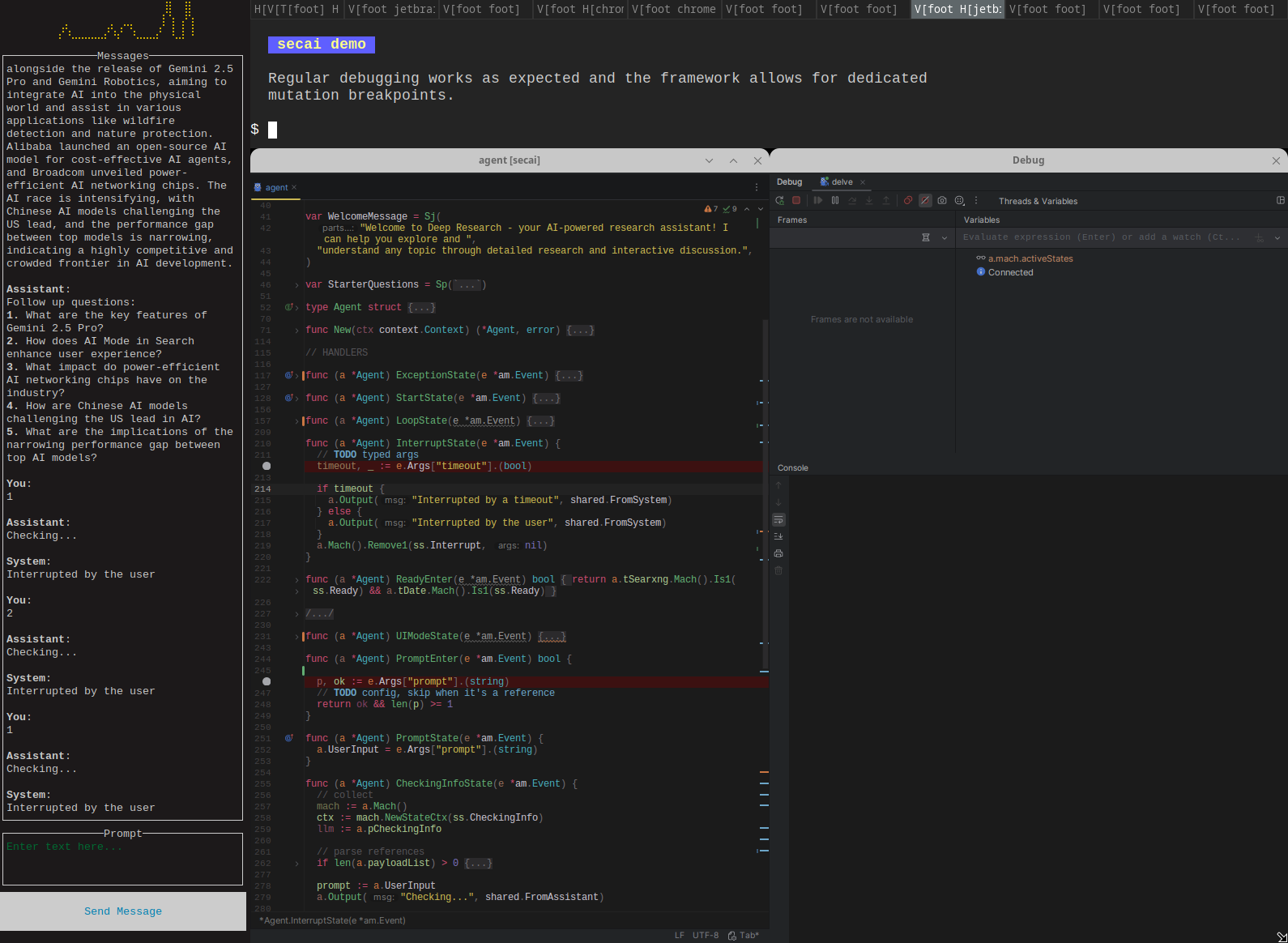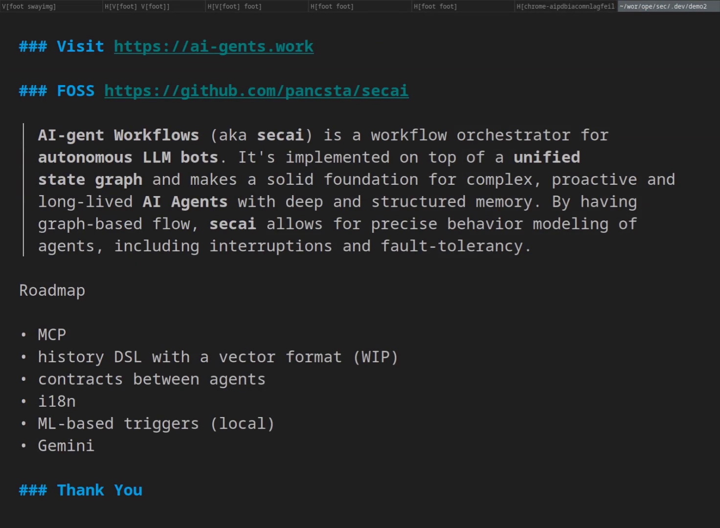 AI-gent Workflows (aka secai) is a platform for AI Agents with a local reasoning layer. It's implemented on top of a unified state graph and makes a solid foundation for complex, proactive, and long-lived AI Agents with deep and structured memory. It offers a dedicated set of devtools and is written in the Go programming language. By having graph-based flow, secai allows for precise behavior modeling of agents, including interruptions and fault tolerance.