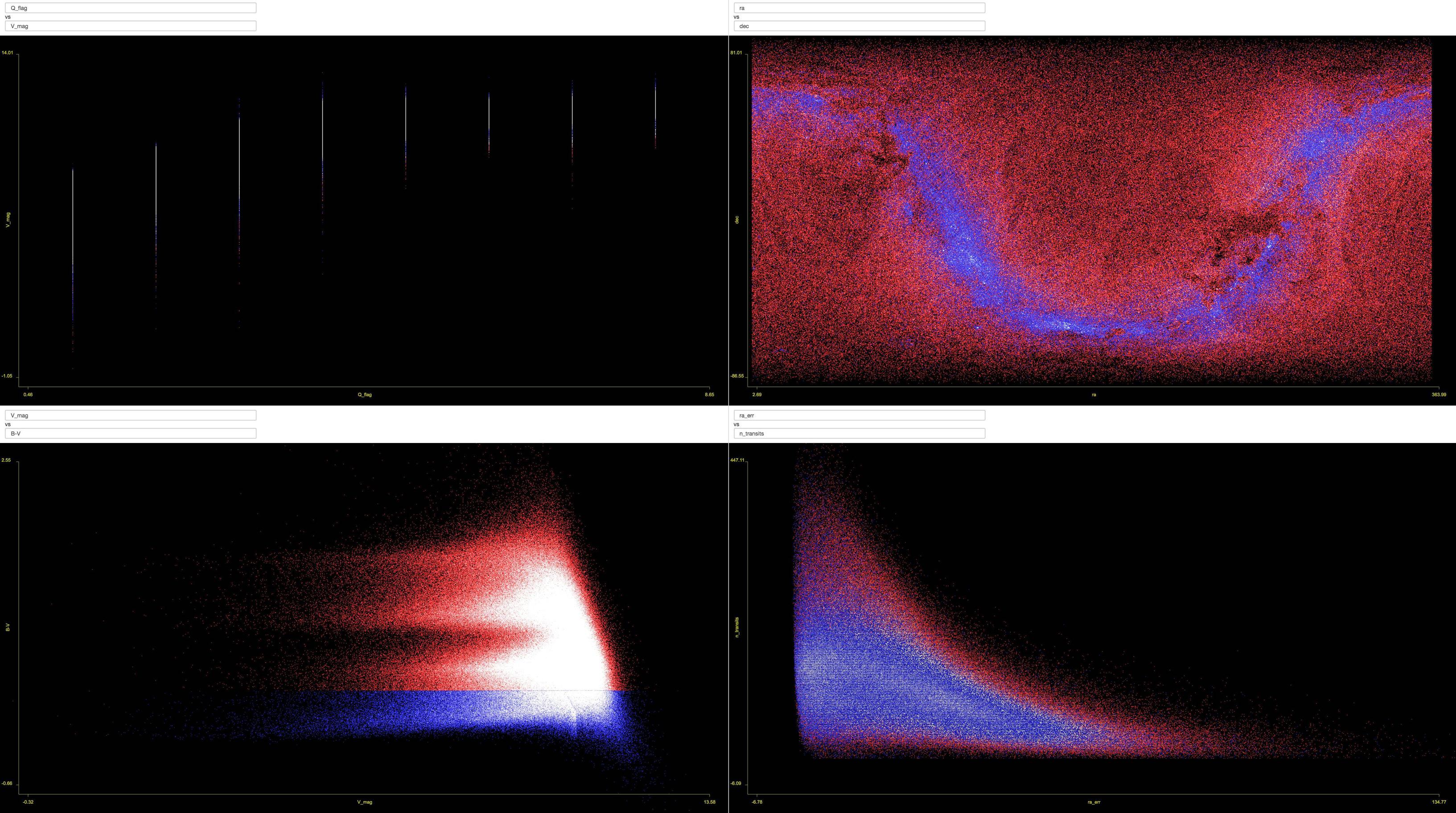 Alternatively, if we highlight just the stars with a high error in their right ascension measurement (right side of the bottom right graph), we tease out the precessing circles that characterize the observation pattern of the telescopes that created the catalog.